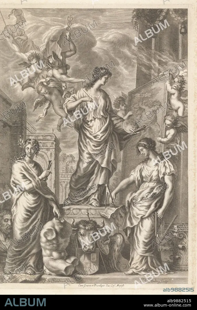 Caption: Allegorical frontispiece with personifications of the arts. Sculpture with chisels, Painting with palette, brushes and canvas, and Architecture with compasses and plumb line. Figures of Roman gods Minerva, Mercury with caduceus and flying cupids in the clouds. Copperplate engraving by Carl Gustav von Amling after an illustration by Joachim von Sandrart from his LAcademia Todesca, della Architectura, Scultura & Pittura, oder Teutsche Academie, der Edlen Bau- Bild- und Mahlerey-Kunste, German Academy of Architecture, Sculpture and Painting, Jacob von Sandrart, Nuremberg, 1675.