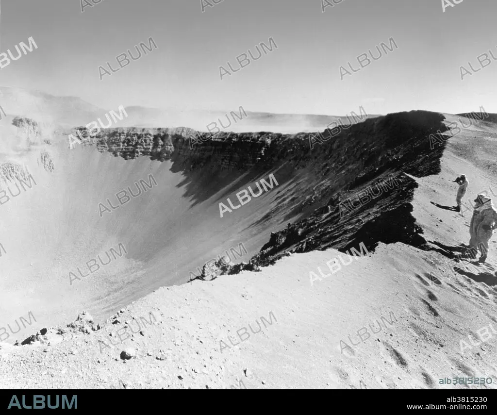 Caption: Storax Sedan, an underground 100-kiloton thermonuclear test conducted at Nevada Test Site on July 6, 1962 as part of Operation Plowshare, was a program designed to develop peaceful uses for nuclear explosives, such as canal and harbor building. Sedan left the largest man-made crater in the United States, displacing 12 million tons of earth and measuring 320 feet deep by 1280 feet in diameter. Here three men in protective suits stand at the edge of the crater.