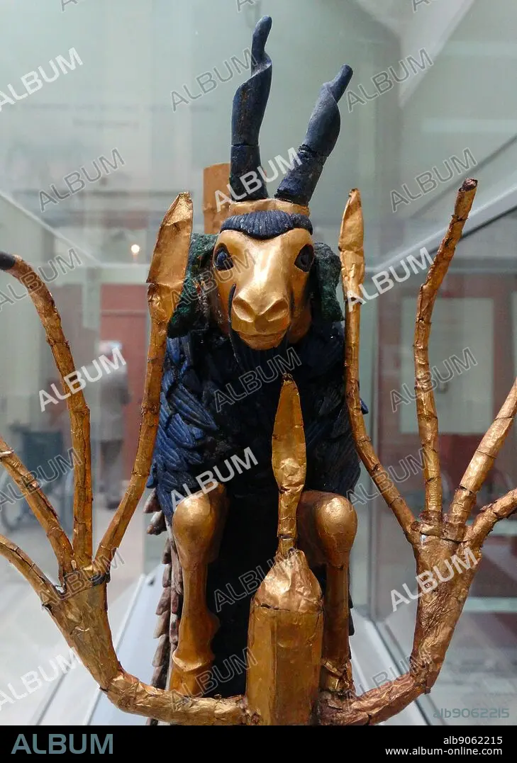 Caption: statuette of a Ram in a Thicket. inlaid wood, silver, shell, limestone, lapis lazuli and gold. Early Dynastic III. Ur. Found at the Royal Cemetery, Ur, Iraq. dated to 2600BC