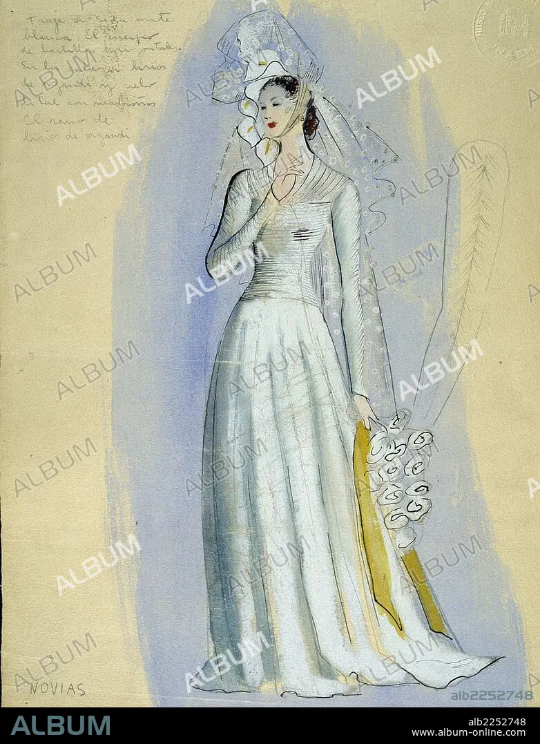 Automatic translation: THEATER. FIGURINES. COSTUME FOR EMILIO BURGOS' BRIDE, YEAR 1943. FOR THE THEATER "NII POBRE NI RICO, BUT EVERYTHING OPPOSITE" BY TONO AND MIGUEL MIHURA. NATIONAL THEATER MUSEUM. ALMAGRO