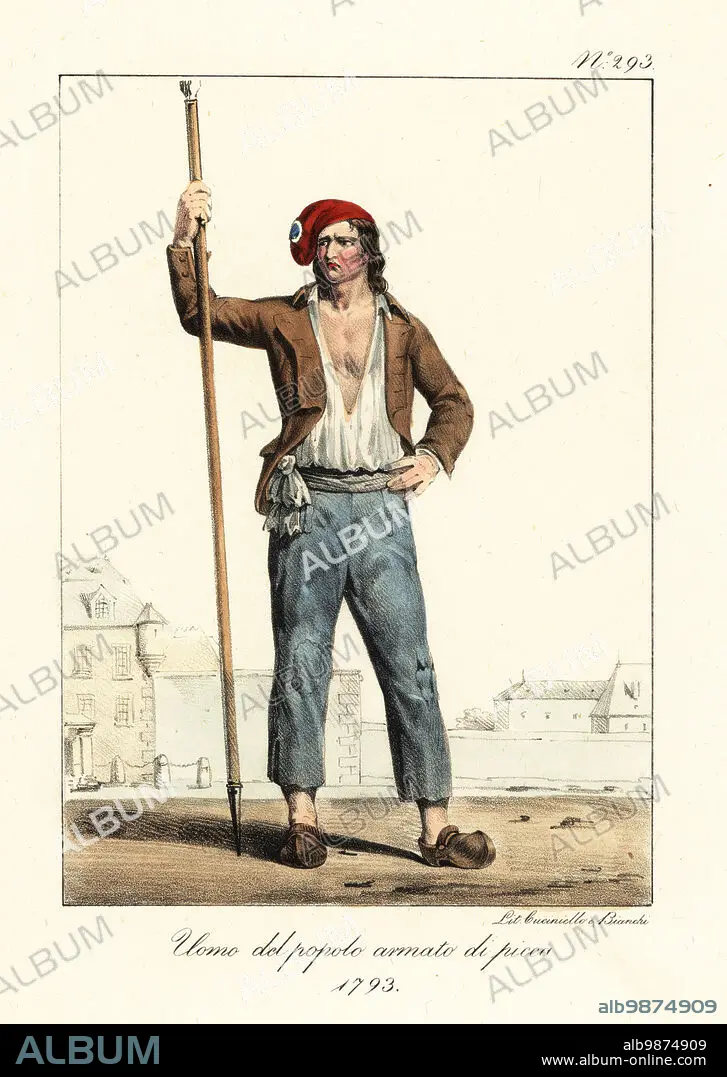 Caption: Costume of a commoner or sans culotte, French Revolution, 1793. He wears a red Phrygian cap with tricolor cockade, brown carmagnole coat, shirt, trousers, sabots or clogs, and holds a pike. Homme du people, arme d'une pique. Handcoloured lithograph by Lorenzo Bianchi and Domenico Cuciniello after Hippolyte Lecomte from Costumi civili e militari della monarchia francese dal 1200 al 1820, Naples, 1825. Italian edition of Lecomtes Civilian and military costumes of the French monarchy from 1200 to 1820.