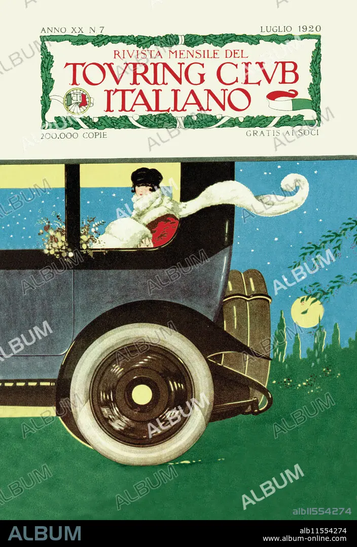 UNKNOWN. Magazine cover for an edition of the Touring Club Italiano (TCI) (in English, Touring Club of Italy) is the major Italian national tourist organization.  The Touring Club Ciclistico Italiano (TCCI) was founded on November 8, 1894 by a group of bicyclists to promote the values of cycling and travel, its founding president was Luigi Vittorio Bertarelli. It published its first maps in 1897. By 1899, it had 16,000 members. With the new century, it promoted tourism in all its forms – including auto tourism – and the appreciation of the natural and urban environments. Under Fascism, starting in 1937, it was forced to Italianize its name to the Consociazione Turistica Italiana.  This cover shows a woman riding in the back of a sedan with her stole flying out the window.