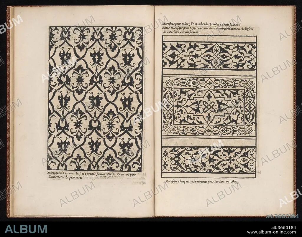 This book of moresques reproduces designs by the Italian artist Francesco Pellegrino, first published in book form by the artist in Paris in 1530 under the title La Fleur de la Science de Pourtraicture. It is considered the first elaborate publication to introduce the exotic designs in Western Europe, although the ornament was known already through the import of textiles and other objects from the Near East. The publication of the ornament in books and prints immensely increased the interest of native artist and it soon became highly fashionable.