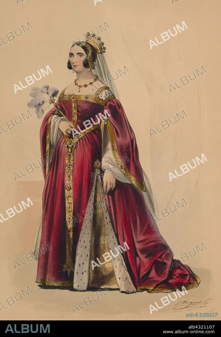 Caption: Guest in costume for Queen Victoria's Bal Costumé, May 12 1842, (1843). Guest, possibly Princess Augusta of Saxe-Weimar-Eisenach (1811-1890), wearing a crown, a jewelled and fur-trimmed dress, and holding an ostrich-feather fan. Members of the Royal Household were expected to wear dress of the Plantagenet period (c1154-1485), although other guests could wear costumes of their own choosing. The costumes were designed under the supervision of James Robinson Planché and were specifically intended to give work to the declining Spitalfields silk industry. The ball of 1842, held at Buckingham Palace in London, was the first of three costume balls held by Queen Victoria and Albert, Prince Consort. The second, on 6 June 1845, was in early Georgian dress, while the third, on 13 June 1851, was in the style of the Restoration. From "Souvenir of the Bal Costumé, given by H.M. Queen Victoria at Buckingham Palace, May 12, 1842 / drawings from the original dresses by Coke Smyth; letterpress by J.R. Planche", 1843. [Paul & Dominic Colnaghi & Co, London, 1843]