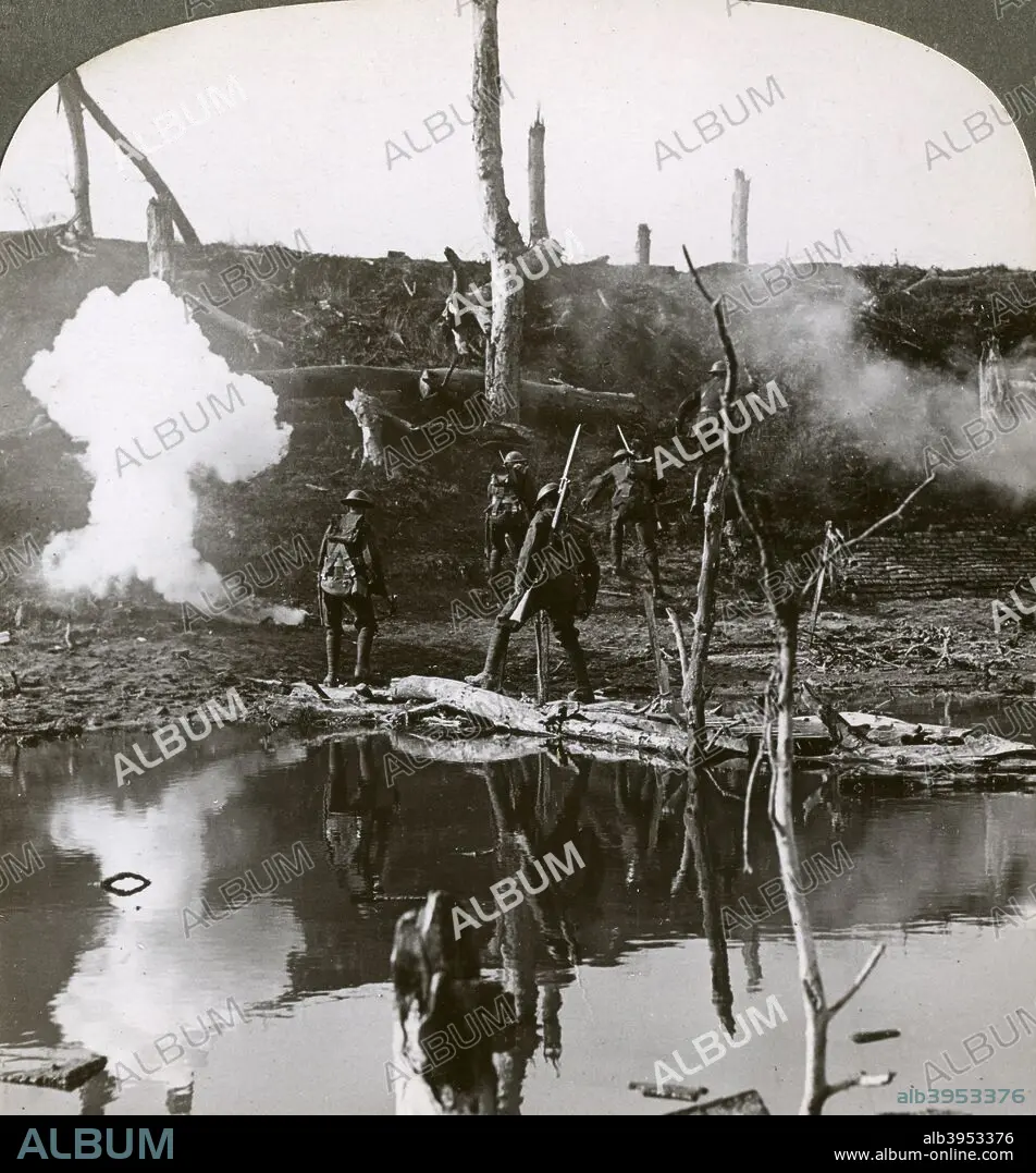 Soldiers crossing the river Ancre, Battle of the Somme, France, World War I, 1916. Scene during the Allied attack on Thiepval Ridge. Stereoscopic card detail.