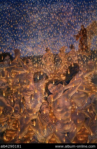 Caption: Amos Nattini (1892-1985), "The Divine Comedy" by Dante Alighieri (1265-1321). Inferno, Canto XVI, Circle 7: Violence. 3rd Ring: Against God, Art and Nature. The Violent against Nature (the Sodomites). Encounter with three Florentines: Dante meets Guido Guerra, Tegghiaio Aldobrandi and Iacopo Rusticucci, who asks for news of the city of Florence.. Private collection. In 1921, for Dante Aligheri's 600th anniversary of death, the Istituto Nazionale Dantesco chose Amos Nattini to illustrate The Divine Comedy. The illustrations have been published in 1923.