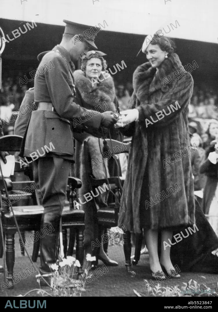 The Duchess of Kent presents the Bugle to the Duke of Kent.The Duchess of Kent, who is patroness of "The Fair Maids Of Kent," hands ot the Duke of Kent a silver bugle, at the stadium, Shorncliffe camp, near Folkestone. The bugle has been presented to the royal west Kent Regt., 2nd Battn. The Queens own, by the Association of men of Kent and Kentish Men. The Battalion carried out the ceremony of trooping the King's colour. May 22, 1937. (Photo by Sport & General Press Agency, Limited).