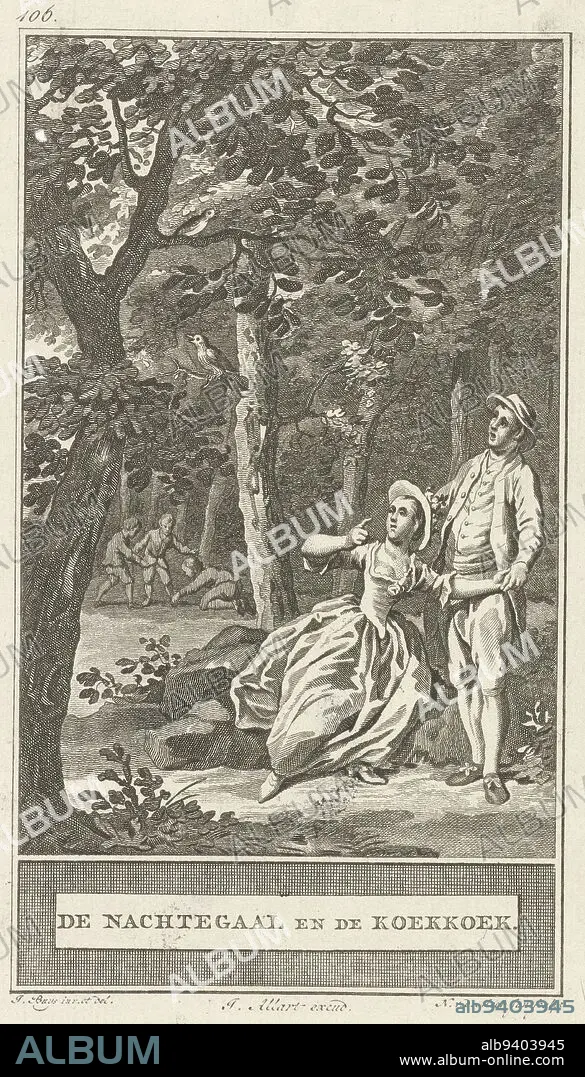 In a tree, a nightingale and a cuckoo are singing The boys in the background cheer for the cuckoo's song The love-making couple in the foreground are moved to tears by the song of the nightingale, Nightingale and the Cuckoo The Nightingale and the Cuckoo , print maker: Noach van der Meer (II), (mentioned on object), intermediary draughtsman: Jacobus Buys, (mentioned on object), publisher: Johannes Allart, (mentioned on object), Amsterdam, 1777, paper, etching, h 245 mm × w 158 mm
