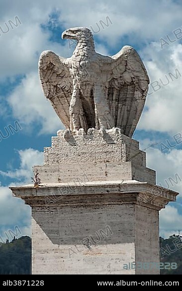 Eagle on a pedestal, Duca d'Aosta bridge over the Tiber River, 1939 to 1942, access to the Foro Italico, formerly Foro Mussolini, Rome, Lazio, Italy