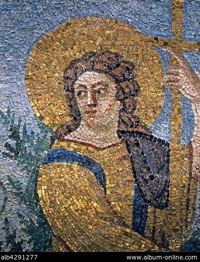 Caption: Mosaic of the Mausoleum of Galla Placidia in Ravenna, Italy.. Lunette of the Christ as the Good Shepherd.. 5th century. The Mausoleum of Galla Placidia was built around 430 (early Christian times).. The construction of the Roman catholic funeral monument and Byzantine style was decided by Empress Galla Placidia.