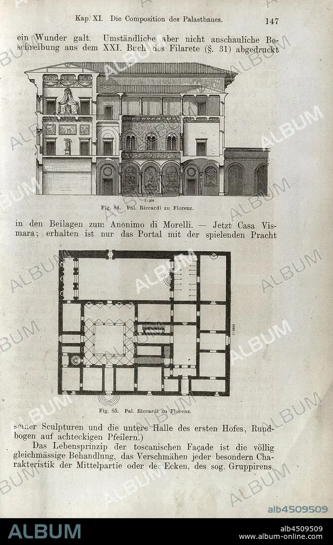 Caption: Pal. Riccardi to Florence, Facade and floor plan of the Palazzo Riccardi in Florence, Fig. 84, 85, p. 147, 1867, Jacob Burckhardt; Wilhelm Lübke: Geschichte der neueren Baukunst. Stuttgart: Verlag von Ebner & Seubert, 1867.