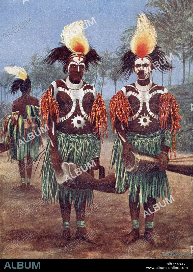 Dancers of the Fly River Region, Papua New Guinea, Oceania in typical traditional costume. After a 19th century illustration. From Customs of The World, published c.1913.