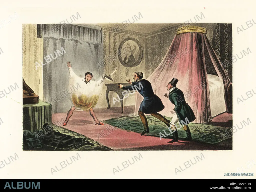 Caption: English gentleman lighting his nightshirt on fire with a candle. John Mytton, drunk, tried to cure his hiccoughs by setting his clothes on fire. He was saved by two men in his bedroom. Damn this hiccup! Chromolithographic facsimile of an illustration by Henry Thomas Alken from Memoirs of the Life of the Late John Mytton by Nimrod aka Charles James Apperley, Kegan Paul, London, 1900.