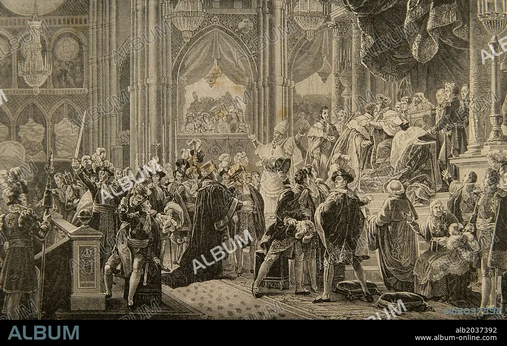 Caption: Charles X (1757-1836). King of France and Navarre. Consecration of Charles X of France in the Cathedral of Reims, on May 29, 1825. Engraving by Kaeseberg. History of France, 1881.