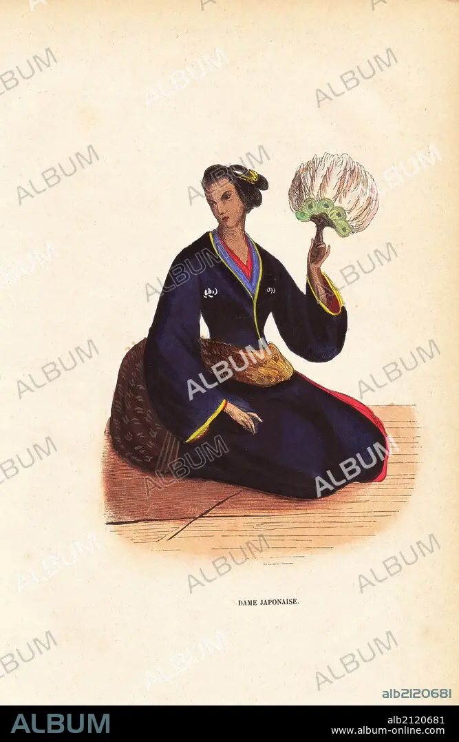 Caption: Japanese woman in kimono and obi, holding a feather fan. Handcoloured woodcut after an illustration by H. Hendrickx from Auguste Wahlen's "Moeurs, Usages et Costumes de tous les Peuples du Monde," Librairie Historique-Artistique, Brussels, 1845. Wahlen was the pseudonym of Jean-Francois-Nicolas Loumyer (1801-1875), a writer and archivist with the Heraldic Department of Belgium.