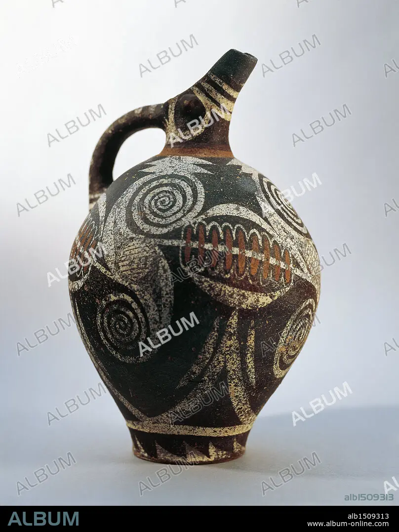 Caption: Minoan civilization, 21th-18th century b.C. Ceramic ewer with oblique spout decorated with spirals and whorls. An example of Kamares pottery. From the Palace of Festos.