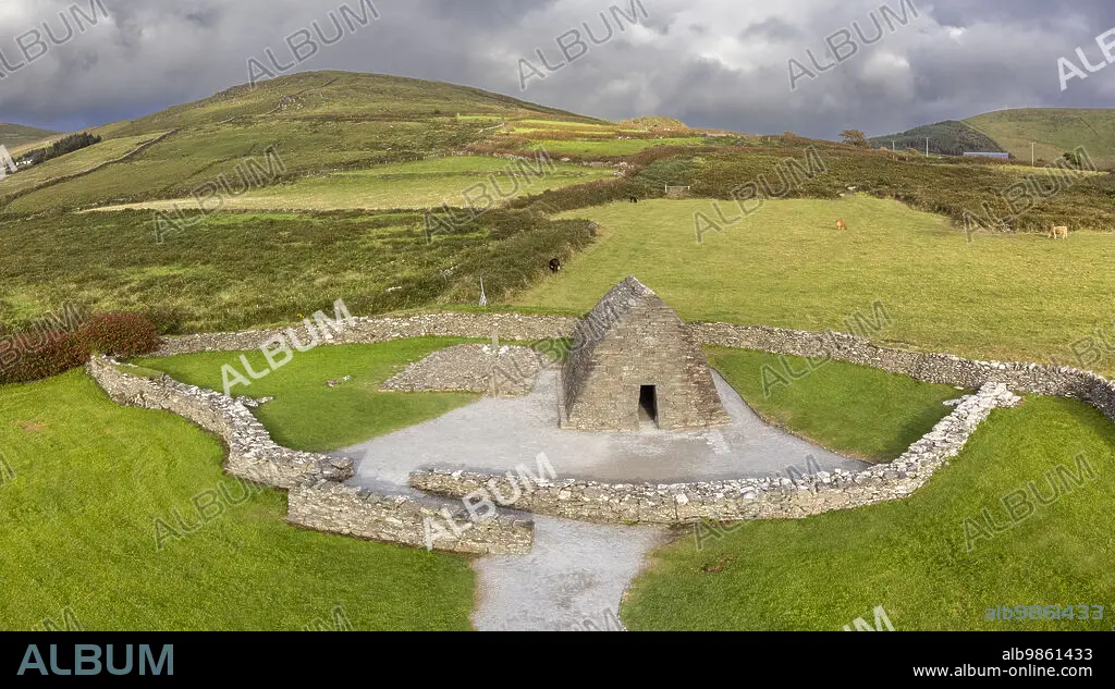 Caption: Gallarus Oratory aerial view (Séipéilín Ghallarais), early Christian church, Dingle Peninsula, County Kerry, Ireland, United Kingdom