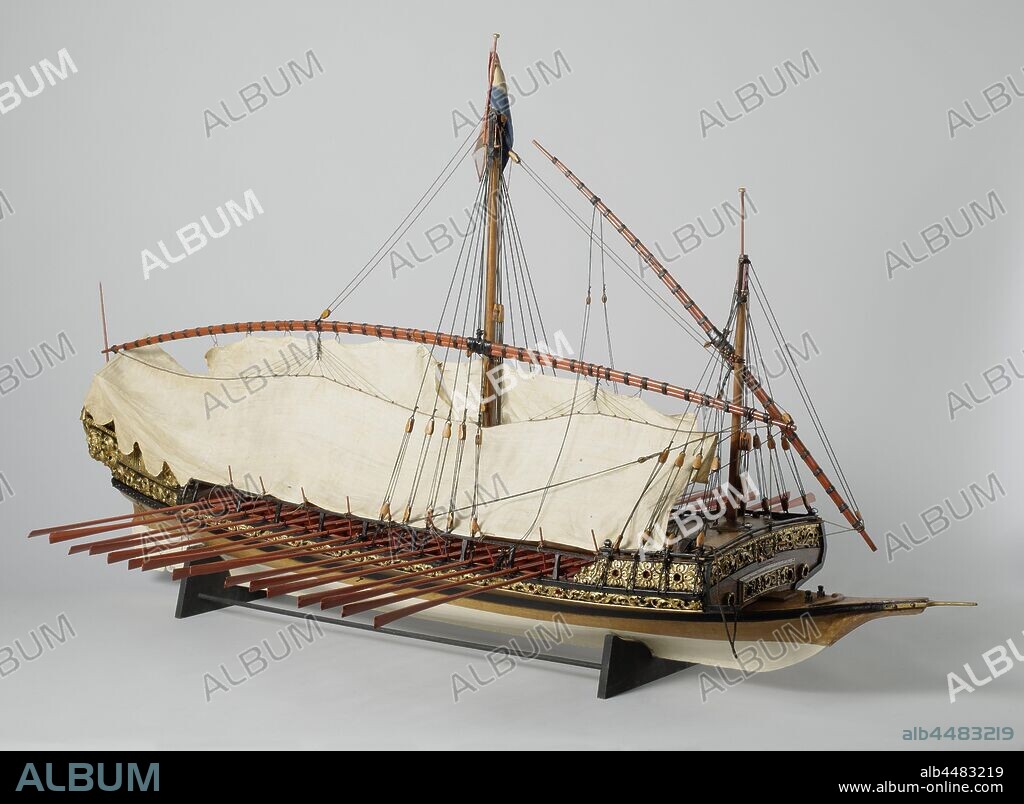 Model of a galley, Model of a Galley, Polychromed, witnessed truss model of a galley. A cannon in the foreship. The ship has a louse patch, a covered foredeck with raised lower sled, then a flank with seventeen dulls on either side, in the middle two narrow decks above each other, behind a cabin with a campaign deck above. Foreship with falling prow with a pointed ram at the end. Round stern with curved stern, hollow out protruding wulf, fence of a storey with western corridor decorated with gilt carving, curved rudder with square king that stays outside the wulf, metal tiller. The sheer runs up to both ends, one bar bolt. Peaked trusses. The model is equipped with an anchor, thirty-four oars and a large sun tent, hanging from the large window and supported by eighteen posts. It is rigged without sails with a breeding mast with latin ra and large mast with latin ra., Peter I the Great (Tsar of Russia), anonymous, Amsterdam, c. 1700 - c. 1750, wood (plant material), brass (alloy), rope, textile materials, h 99.5 cm × l 186 cm × w 42 cm