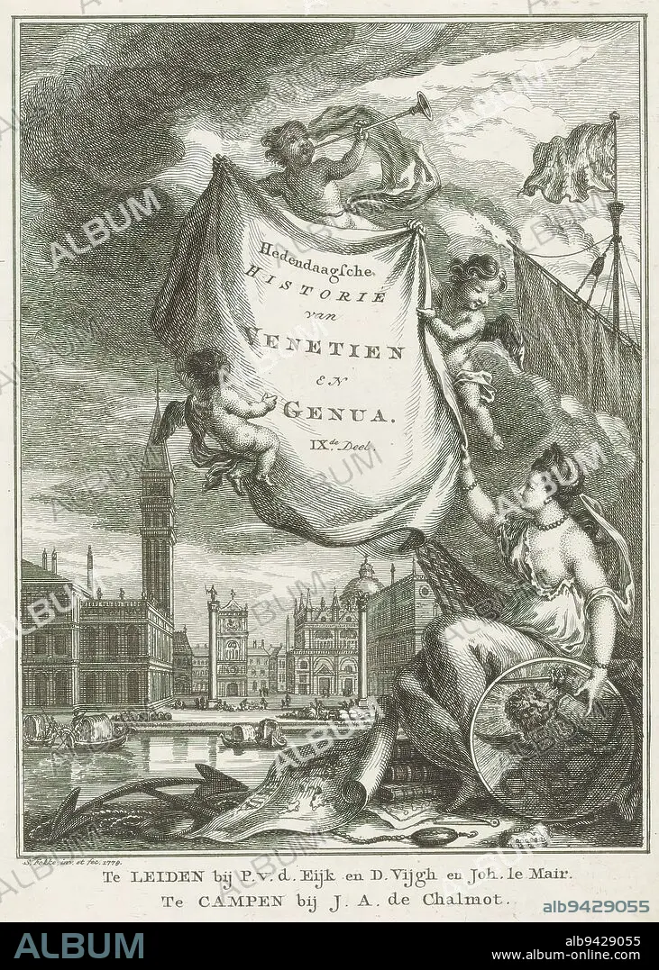 Caption: Allegory of Venice and Genoa, Contemporary History of Venice and Genoa, IXth Part (title on object), Title page for: S.n., Hedendaagsche historie of Het vervolg van de Algemeene historie, 1779, Three putti hold a cloth with the title in the air. To the right is a woman holding a shield with a lion. At her feet are a map of Genoa, an anchor and books. In the background, a view of Venice., print maker: Simon Fokke, (mentioned on object), after own design by: Simon Fokke, (mentioned on object), publisher: Pieter van der Eyk, (mentioned on object), publisher: Leiden, publisher: Leiden, publisher: Leiden, publisher: Kampen, 1779, paper, etching, engraving, height 166 mm × width 121 mm