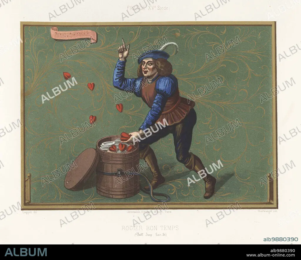 Caption: The fool Roger Bontemps locking his heart in a forgotten box. Rogier Bon Temps, France, 15th century. From Rene d'Anjou's Roman de tres-douce Mercy au Cuer d'amour epris, 1457, Bibliotheque Imperiale, Fonds de la Valliere MS 36. Chromolithograph by Thurwanger after an illustration by Claudius Joseph Ciappori from Charles Louandres Les Arts Somptuaires, The Sumptuary Arts, Hangard-Mauge, Paris, 1858.