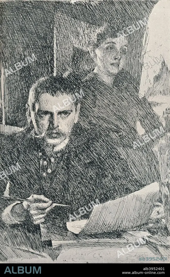 Caption: Mr. and Mrs. Zorn, 1890. A self portrait of the artist Anders Leonard Zorn (1860-1920) and his wife Emma Amalia Zorn (1860-1942). After an etching by Anders Leonard Zorn (1860-1920). From The Studio Volume Twelve by [London Offices of the Studio V, London, 1898]