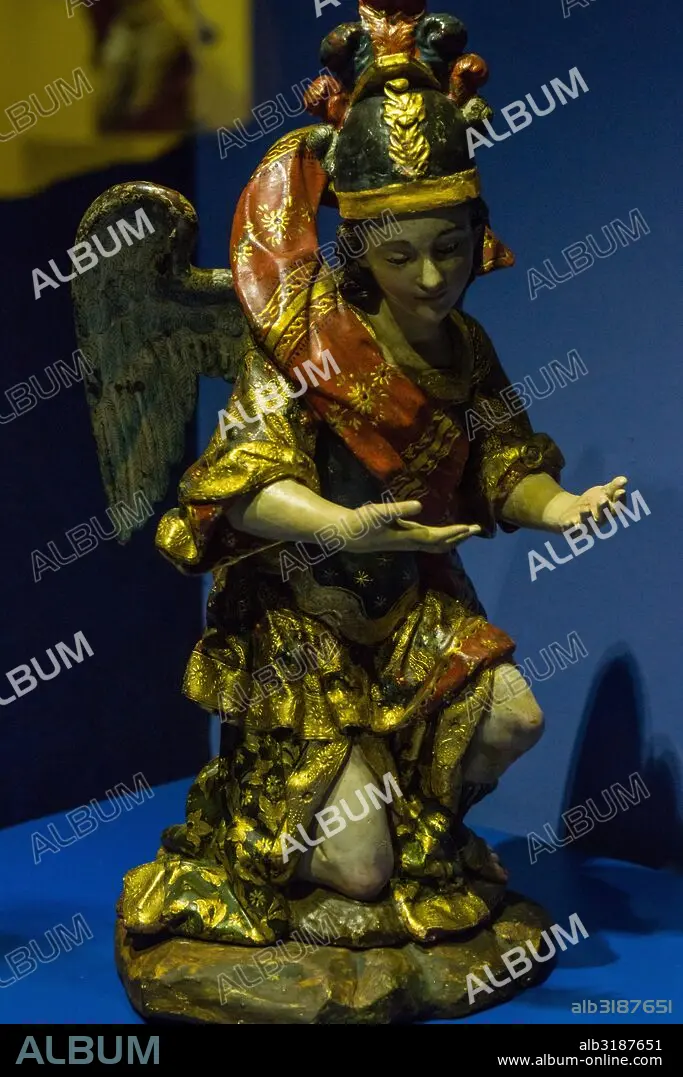Automatic translation: archangel Saint Gabriel, wood carving, stewed, incarnated and polychrome, 18th century, colonial museum, Hotel museum Casa Santo Domingo, former Convent of Santo Domingo, Antigua Guatemala, Sacatepéquez department, Guatemala, Central America