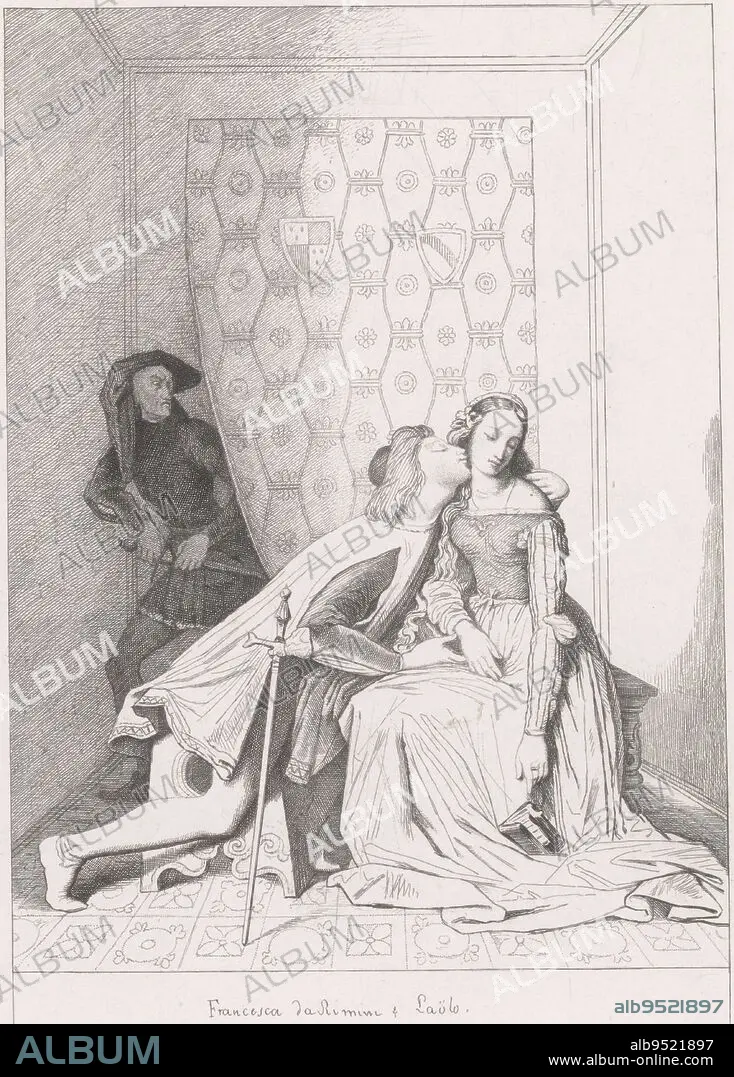 Caption: Gianciotto discovers the loving Paolo and Francesca. Paolo and Francesca Francoise de Rimini d'apres Ingres , print maker: Edouard Taurel, Jean Auguste Dominique Ingres, (mentioned on object), Henriette Ursula Claire Taurel, (mentioned on object), Amsterdam, 1885, paper, etching, h 250 mm × w 177 mm
