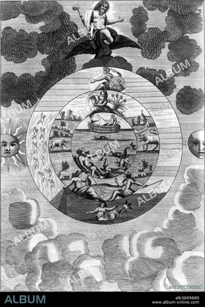 Caption: Mutus Liber was an alchemical text published in France in the later half of the 17th century. The book contained only images, no words, and described a certain path to the Philosopher's Stone. In the third plate of the Mutus Liber Jupiter holds in his right hand a scepter crowned, left the Sun, the Moon right. In the center, three circumscribed circles, the outer circle is itself divided into three parts: the first part, the most important, is composed of three sets of horizontal lines multiplied by two each time (2 - 4 - 6), a peacock doing cartwheels luminary is accompanying a goddess. The lower part shows a siren, the left ten white birds may be doves. The middle circle shows the top symbols of spring and the flowering seems like the middle part in the background and is Aries and Taurus can be seen. The lower part shows the alchemical couple left with the woman holding a lantern and right, the man holding a fishing rod that falls in the outer circle. The inner circle represents the boats moving in the sea in the foreground, Neptune in his chariot armed with his trident which exceeds the circle and ends the alchemical couple; further, a boat where we see evolve the alchemical couple.