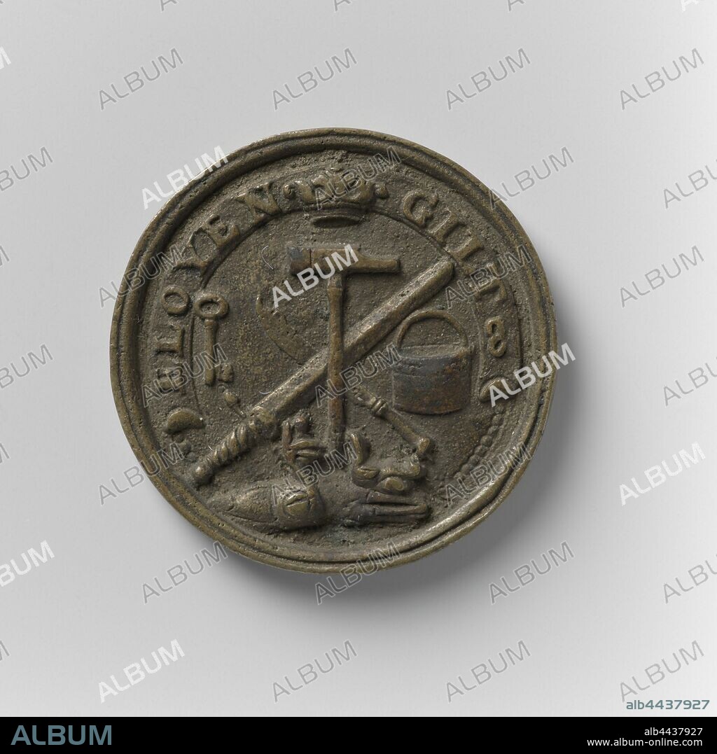 Blacksmith's Guild of Amsterdam, Guild Medal of Karel Blom, Brass Medal. Front: crowned coat of arms, flanked by two lions above cartouche with inscription. Reverse: cross consisting of crowned hammer, sword and knife, left: key, right: bucket, below: rifle lock inside a wrap on pennant, Amsterdam, Karel Blom, anonymous, 1774, brass (alloy), engraving, d 3.7 cm × w 25.54 gr