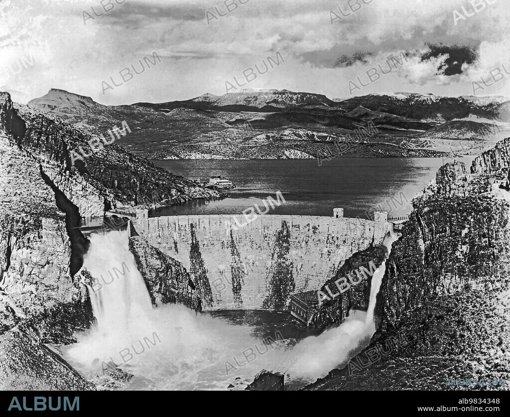 Salt River, Arizona c. 1920 Theodore Roosevelt Dam with Theodore Roosevelt Lake behind it. The dam was constructed betwen 1905-1911, on the Salt River in Arizona.