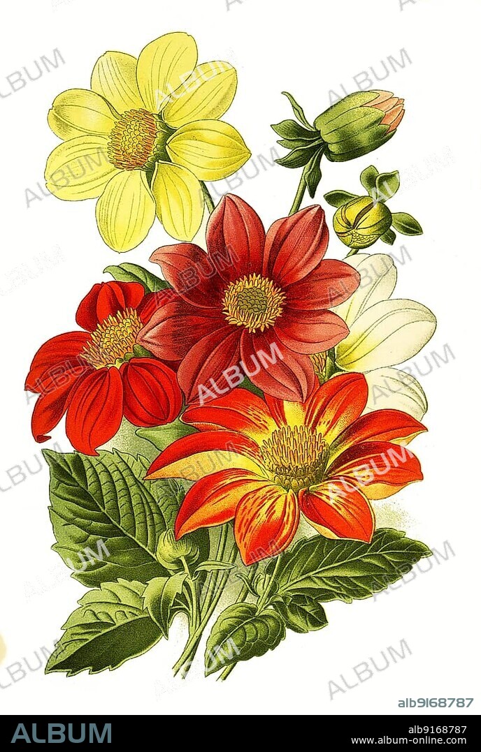 Dahlia variabilis, Dahlia. Dahlia, Flower, Plant, Historic, digitally restored reproduction of a 19th century original