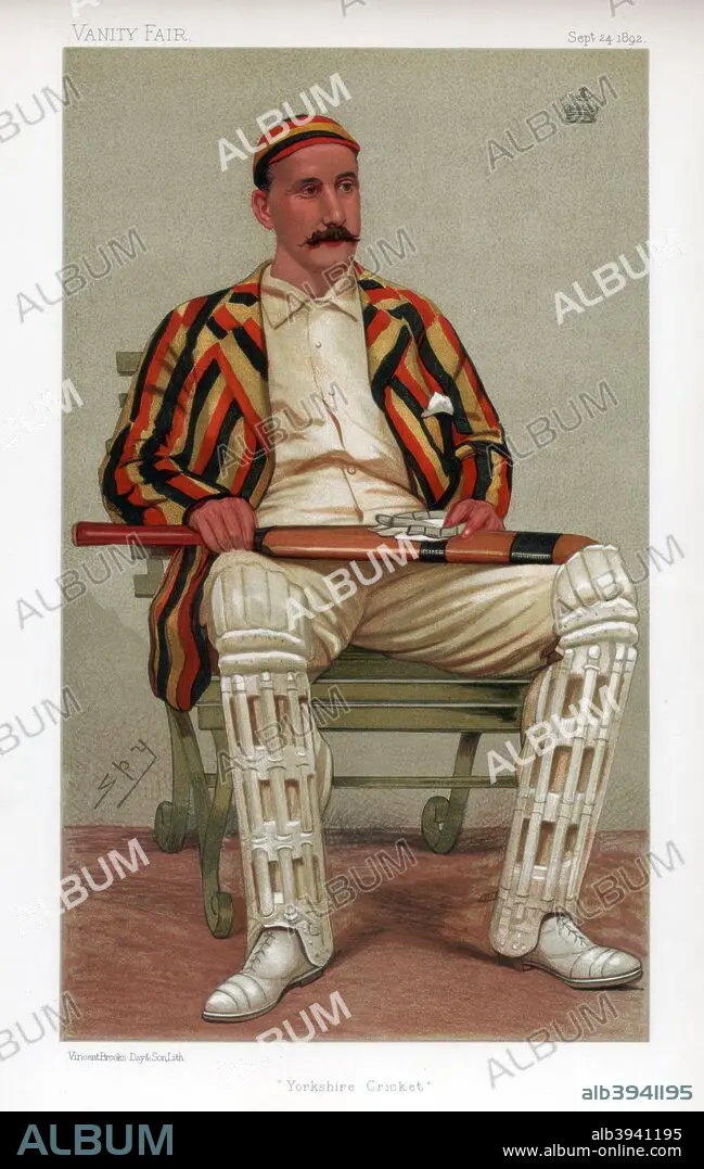 'Yorkshire Cricket', 1892. A portrait of Lord Hawke. Martin Bladen Hawke, 7th Baron Hawke (1860-1938) captained the Yorkshire County Cricket Club for 28 seasons. He also captained England in four test matches, winning all of them. After retiring as a player he served as a selector for the England team as President of the MCC. Cartoon from Vanity Fair, 24th September 1892.