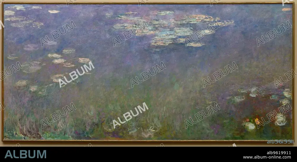 Caption: Water Lilies (Agapanthus), c. 1915-26. Monet spent the last thirty years of his life painting the lily pond at his home in Giverny, a small town on the river Seine, just north of Paris. While his initial exploration of the water lily theme (1902-8) produced smaller works more descriptive of a garden setting, the later paintings focus on the water's shimmering surface, indicating the surrounding trees and lush bank only through reflections. Here reflection and reality merge in strokes of blue, violet, and green. Fronds of water plants sway underwater and passing clouds are reflected above. By 1915 Monet had conceived a plan, called his Grande Décoration, for arranging a series of monumental water lily paintings in an oval room, thus creating a continuous panorama that would surround and enclose the viewer in an environment of pure colour. That installation is located in two oval rooms in the Musée de lOrangerie in Paris. Cleveland's painting is the left panel of a three-part variation on this water lily theme. Its companions are now in the St. Louis Art Museum and the Nelson-Atkins Museum in Kansas City, Missouri.