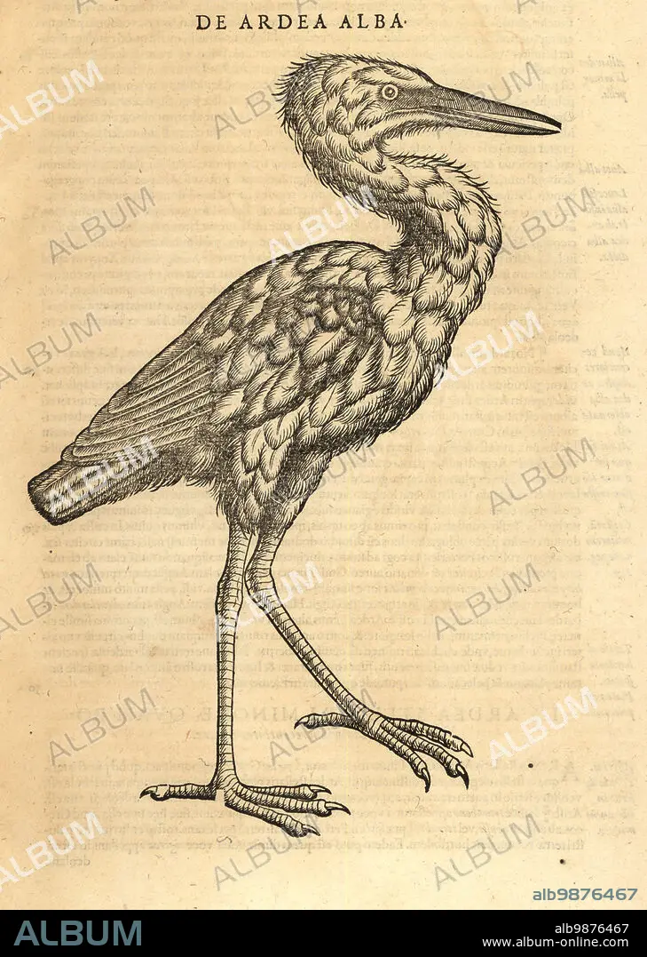 Caption: Great egret or common egret, Ardea alba. Great white heron. De Ardea alba. Woodcut engraving after an illustration by Lucas Schan and Conrad Gessner from Conrad Gessners Historiae Animalium, De avium natura, (Natural history of animals: birds), Frankfurt, Wechel for Cambier, 1585.