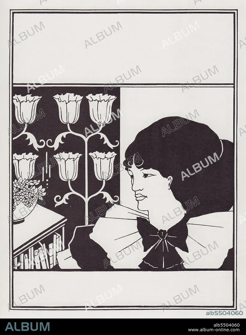 Caption: Cover Design for The Yellow Book, Vol II, 1894. A woman wearing a starched dress with bow, a bookcase, and a background of stylised tulips. From "The Best of Beardsley" edited by R. A. Walker, [The Bodley Head, London, 1948]