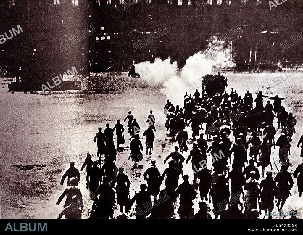 Caption: The October Revolution takes place in Russia. Workers, peasants and soldiers on way to storm the Tsar's Winter Palace in Petrograd.