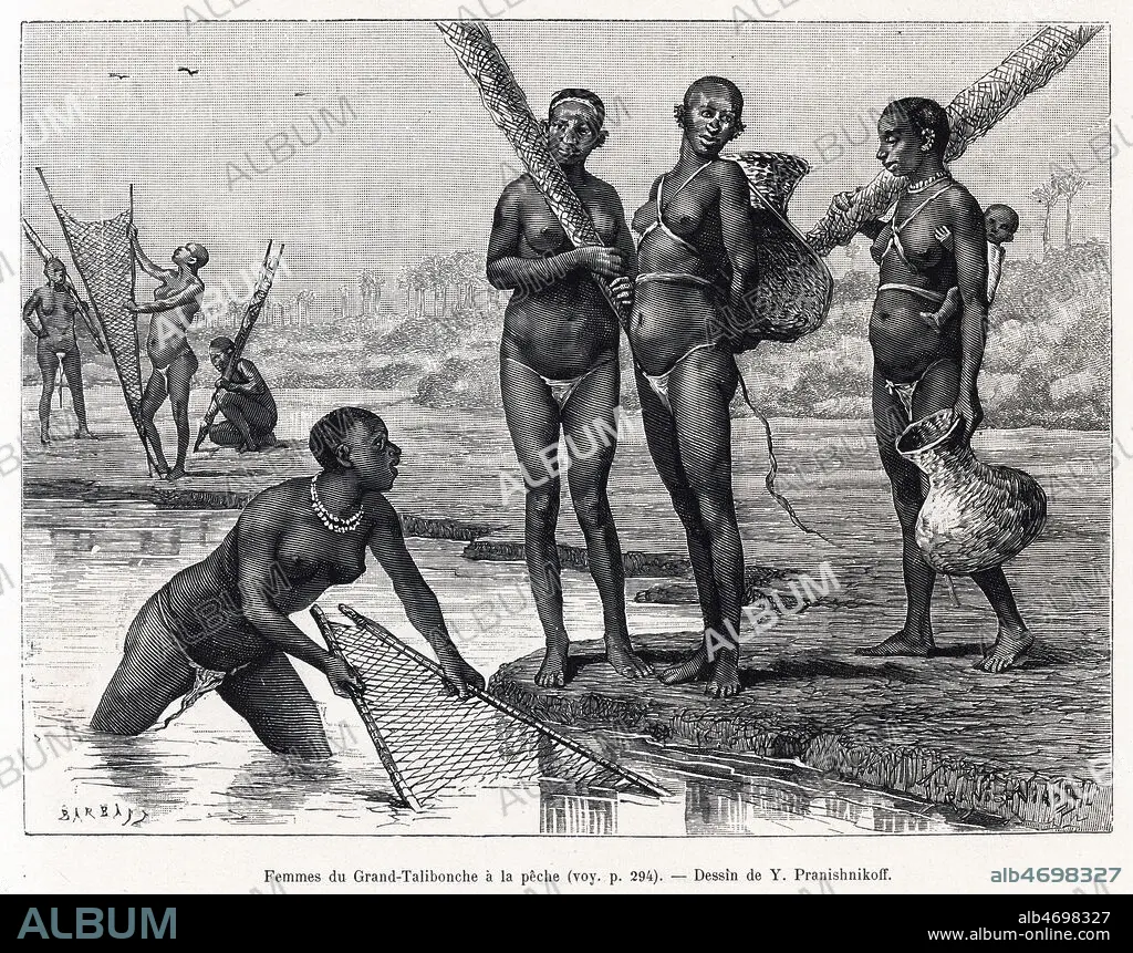 Femmes du Grand-Talibouche a la peche. Illustration de Ivan PRANICHNIKOFF (1841-1909) pour Voyage aux pays des Bagas et du Rio-Nunez par le lieutenant COFFINIERE de NORDECK (1848-1917) repris dans Le Tour du Monde de 1886. Credit : Collection Kharbine-Tapabor
