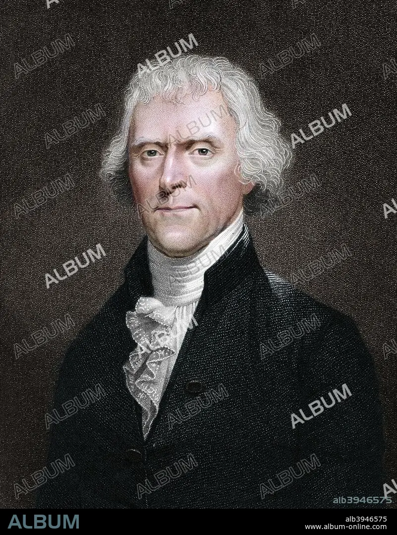 Caption: Thomas Jefferson, American president. Jefferson (1743-1826) was the primary author of the Declaration of Independence and one of the major figures of early American political history. After serving as the nation's first Secretary of State (1790-1793) and as Vice-President to John Adams (1797-1801), he was elected the third president of the USA, holding office from 1801-1809. (Colorised black and white print).