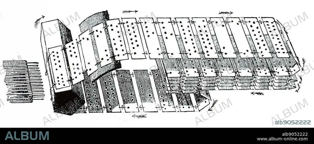 Caption: An engraving depicting punched cards coded with weaving pattern for the operation of a Jacquard loom. Dated 19th century