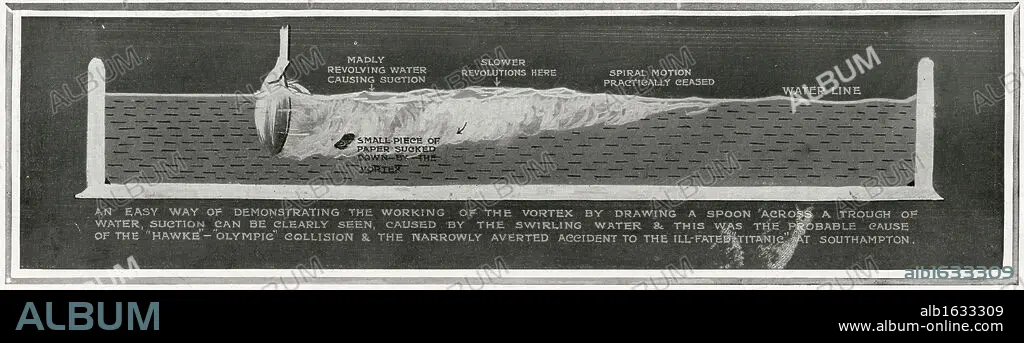 Illustration - Vortex. RMS Titanic Sinking. Illustration demonstrates the working of the vortex by drawing a spoon across a trough of water. Suction can be clearly seen, caused by the swirling water and this was the probable cause of the 'Hawke' - 'Oympic' collision and the narrowly averted accident to the Titianic at Southampton. Titanic was built by Harland & Wolff in Belfast Ireland during 1910 - 1911 and later sank on April 15th, 1912 off the coast of New Foundland after striking an iceberg during her maiden voyage from Southampton, England to New York, USA. (Photo by Titanic Images/Universal Images Group)