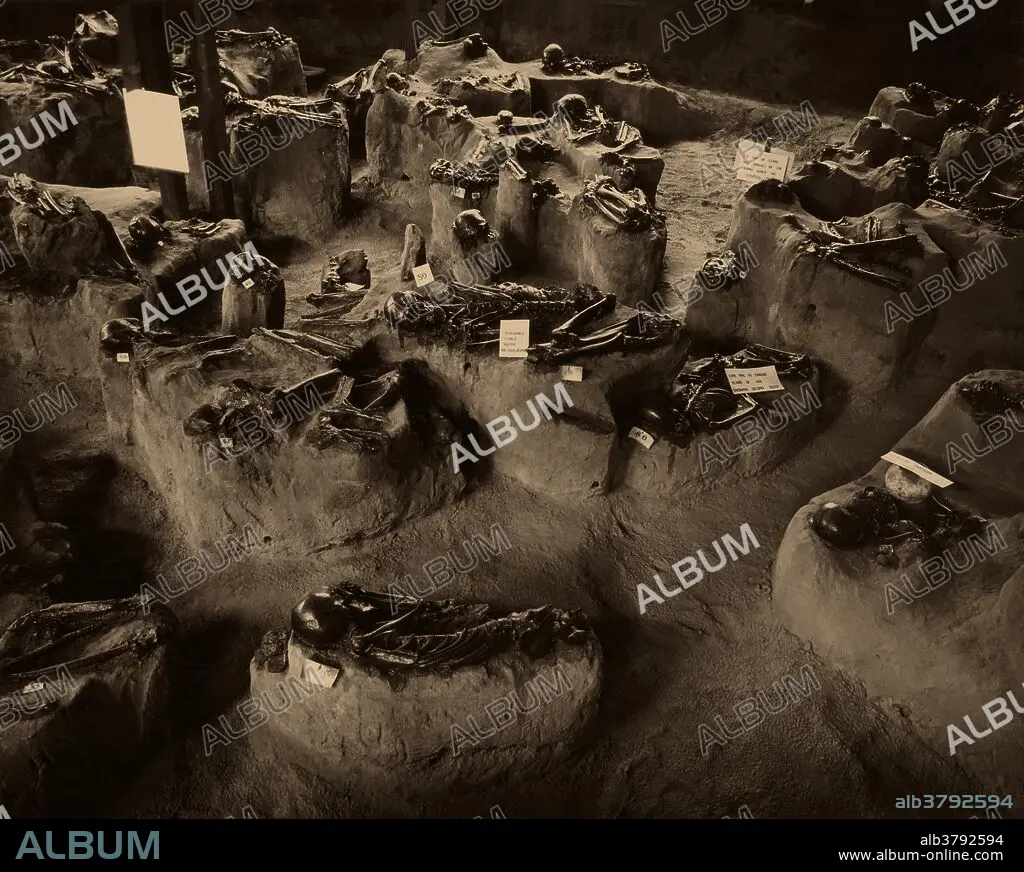 Caption: Native American burial pit; Salina, Kansas. 140 skeletons on view, perhaps 1,200 buried in layers.