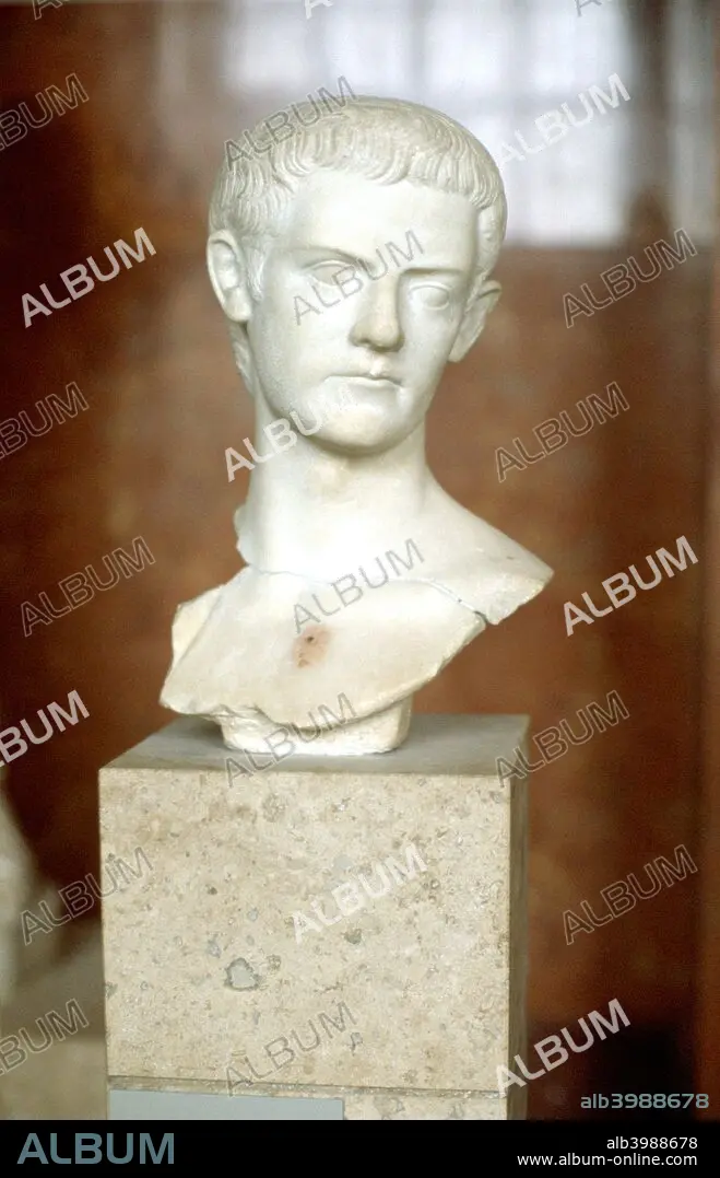 Caption: Marble bust of the Emperor Caligula. Caligula (12-41 AD) was the third Roman Emperor, ruling from 37 until he was assassinated in 41. Roman historians portray him as eccentric, depraved, cruel and insane, but some modern scholars question whether their accounts may have been biased or exaggerated. From the Louvre, Paris.