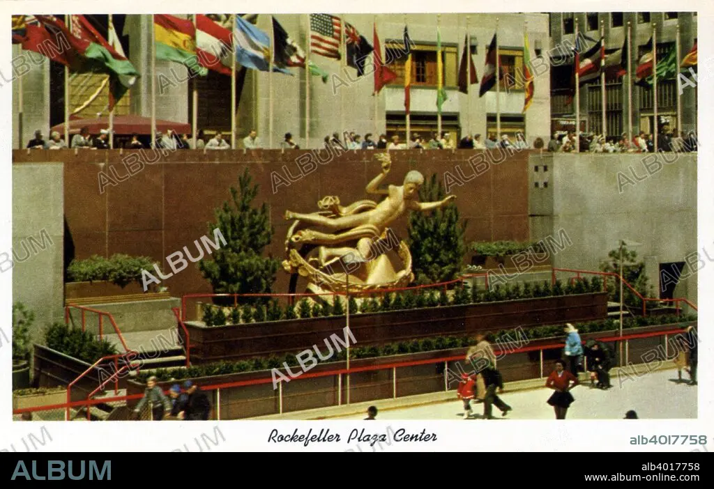 Rockefeller Plaza Center, New Your City, New York, USA, 1956. Vintage postcard showing the plaza of the Rockefeller Center, with the colourful flags of the United Nations and Paul Manship's statue of Prometheus bearing his gift of fire to mankind. The Art Deco Rockefeller Center complex is made up of several buildings, fourteen of them built between 1931 and 1939. American industrialist John D Rockefeller (1839-1937) financed the project.
