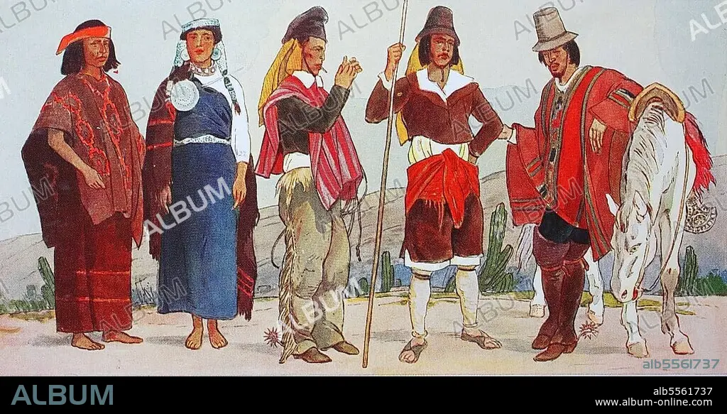 Caption: Kleidung, Mode in Südamerika, Chile um das 19. Jahrhundert, von links, ein Aurakan, ein chilenischer Indianer, ein schicker Araukaner, dann ein Peon, ein Tagelöhner, ein Landbewohner Chiles, dann ein Carretero, ein Ochsenwagenbauer und ein chilenischer Dorfbewohner mit Filzhut, digital restaurierte Reproduktion einer Originalvorlage aus dem 19. Jahrhundert