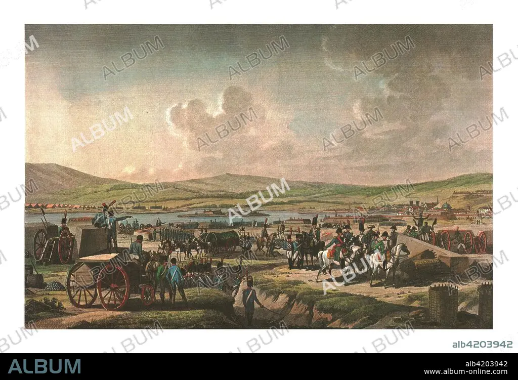 Caption: Napoleon visiting the siege works at Danzig led by Marshal Lefebvre, 9 May 1807, (c1850). Bonaparte made Danzig a free city after he defeated the Fourth Coalition in 1807. It had previously been in Prussian hands. Print from a series depicting the campaigns of Napoleon I, published c1850.