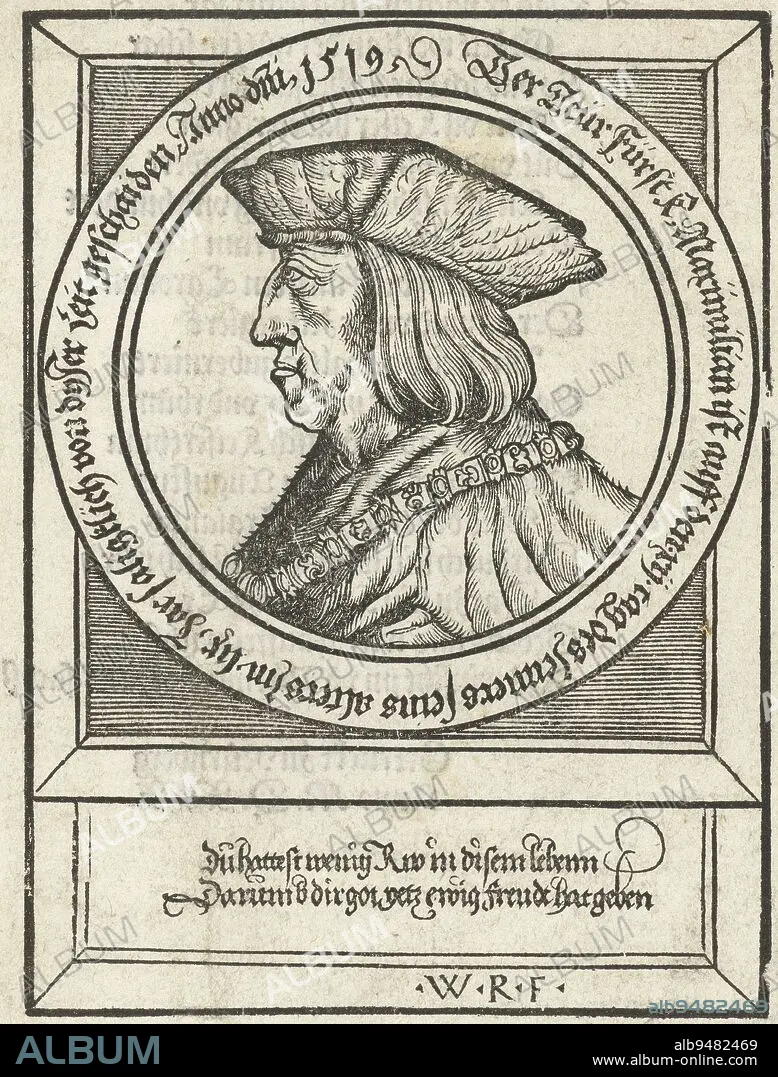 Caption: Portrait of Emperor Maximilian I, Albrecht Dürer (school of), 1530, Portrait of Emperor Maximilian I en profil, the badge of the Golden Fleece around the neck. Around the portrait a border inscription and below it a caption in German in gothic script. On verso also German text in Gothic script., print maker: Albrecht Dürer, (school of), print maker: Wolfgang Resch, (mentioned on object), print maker: Neurenberg, print maker: Germany, 1519 and/or 1530, paper, h 139 mm × w 103 mm