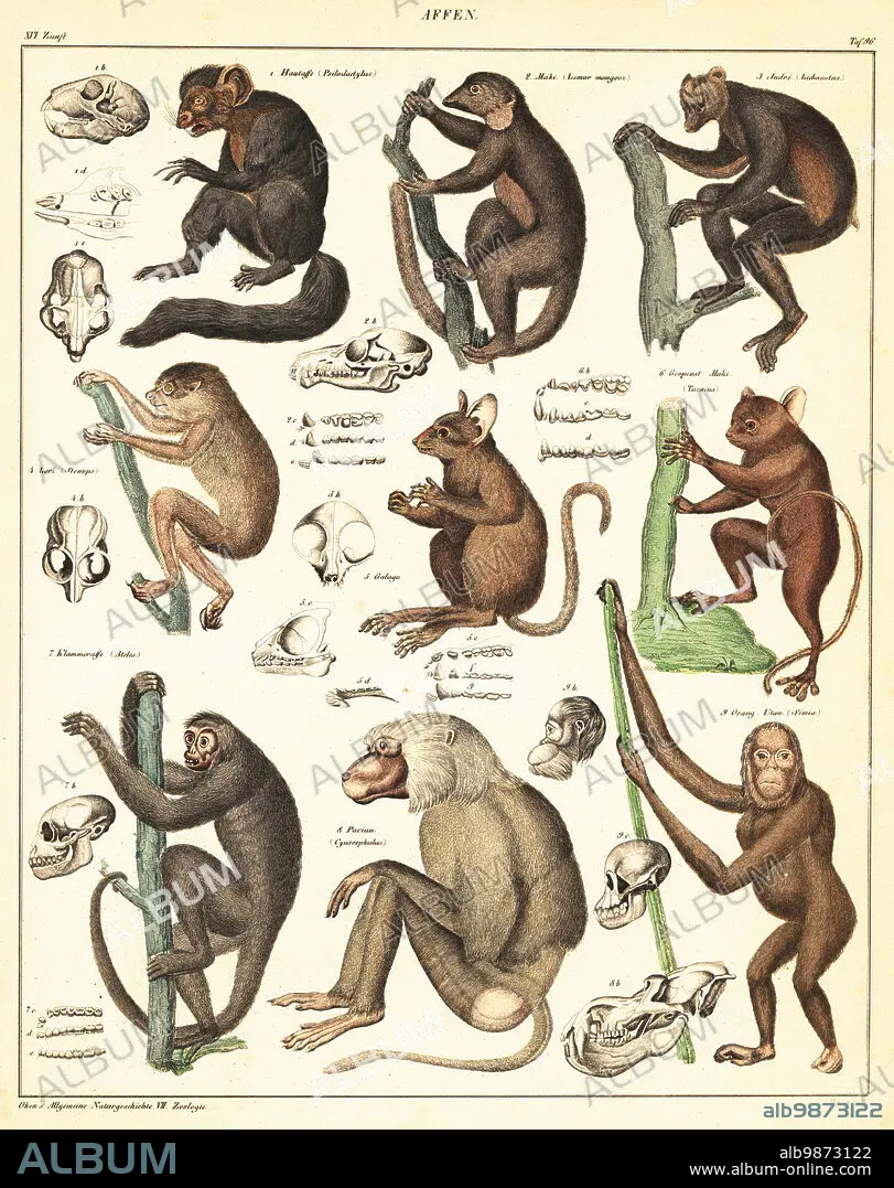 Varieties of apes. Affen. 1 endangered aye-aye, Daubentonia madagascariensis, Psilodactylus, Hautaffe, 2 endangered ring-tailed maki, Lemur catta, Lemur mongooz, 3 critically endangered indri, Indri indri, Lichanotus, 4 endangered red slender loris, Loris tardigradus, Stenops, 5 bushbaby, Galago species, 6 tarsier, Tarsius species, gespenst maki, 7 red-faced spider monkey, Ateles paniscus, Klammeraffe, 8 hamadryas baboon, Papio hamadryas, Pavian, 9 critically endangered Bornean orangutan, Pongo pygmaeus. Handcoloured lithograph by C. Mayer from Lorenz Oken's Universal Natural History, Allgemeine Naturgeschichte fur alle Stande, Stuttgart, 1841.