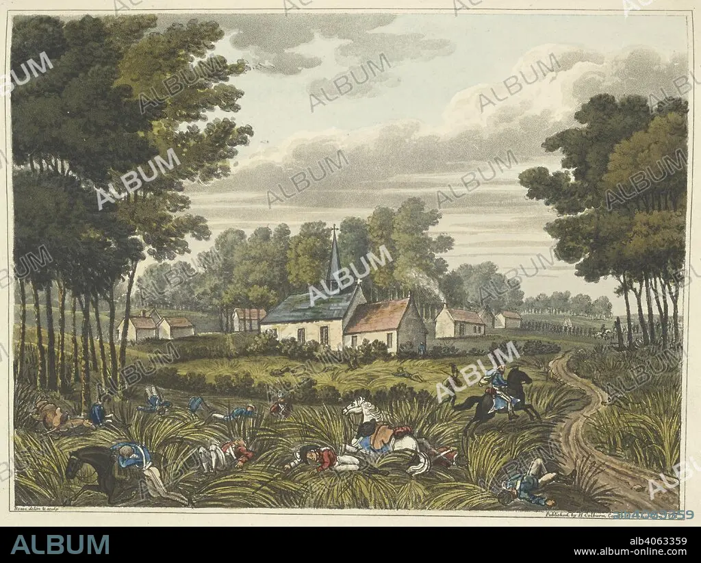 Caption: 'Chateau of Frishermont. It was here on this spot, that Sir T. Picton received his death.- Here, also through the wood, the Prussians under the command of Bulow came up, towards the close of the battle (of Waterloo).' A number of dead and wounded soldiers laying in the grass. An Historical Account of the Campaign in the Netherlands, in 1815, under His Grace the Duke of Wellington, and Marshal Prince Blucher, comprising the battles of Ligny, Quatrebras, and Waterloo; with a detailed narrative of the political events connected with those memorable conflicts down to the surrender of Paris, and the departure of Bonaparte for St. Helena ... Embellished with ... plates ... from drawings ... by James Rouse. London : Henry Colburn, 1817. Source: 193.e.9 Plate XI - J.