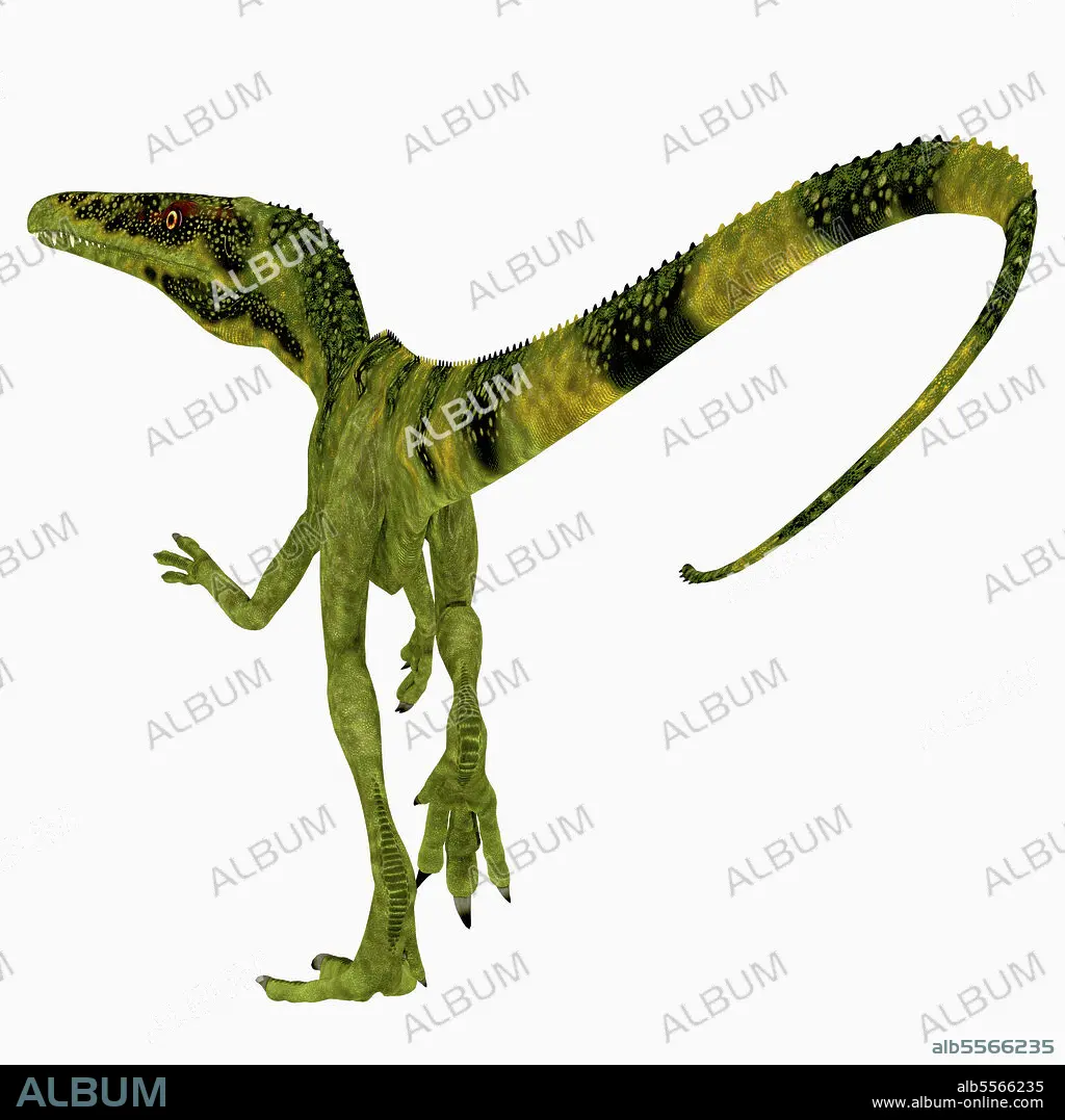 Juravenator dinosaur, rear view. Juravenator was a carnivorous theropod dinosaur that lived in Germany during the Jurassic Period.