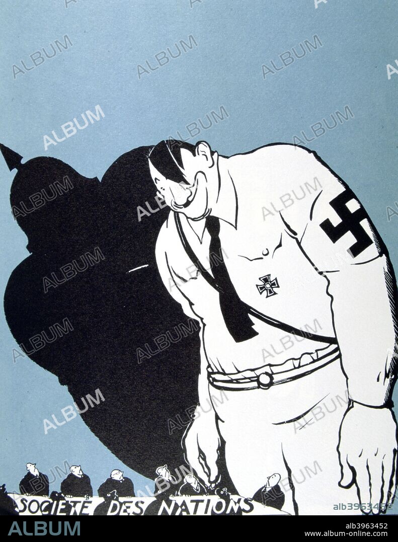 'Hitler and the League of Nations', 1935. A huge Hitler and the shadow of German militarism loom above the delegates at a meeting of the League of Nations. Hitler withdrew Germany from the organisation after he came to power in 1933. A cartoon in Le Témoin, 10 March 1935.
